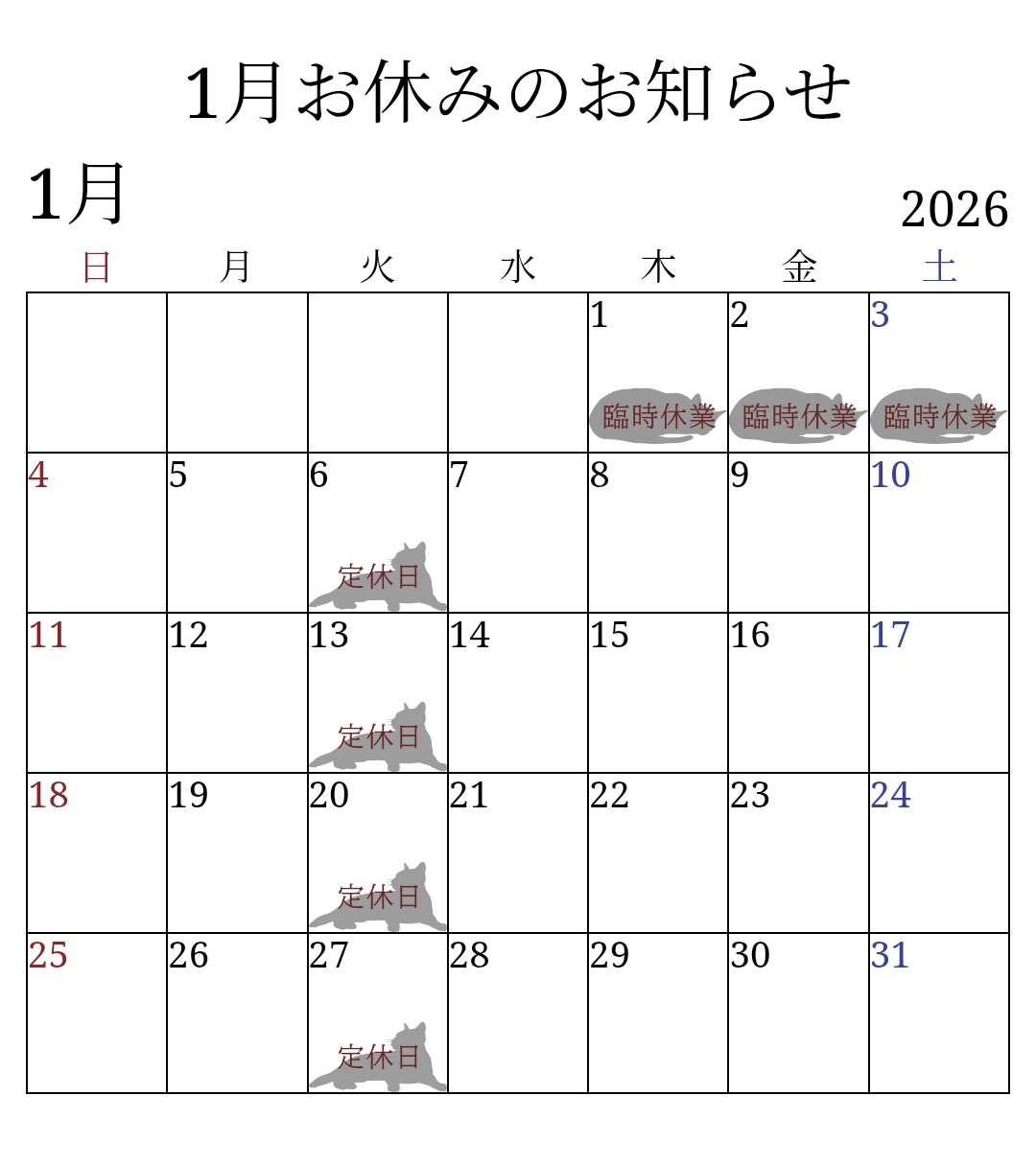 2025年1月より定休日変更のお知らせ